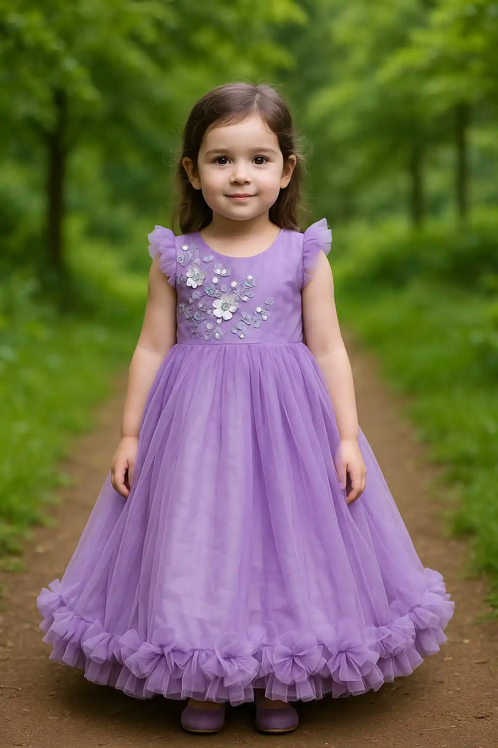Turn every moment into a magical memory with our Lavender Blossom Gown, a dreamy dress designed for birthday parties, flower girl moments, and special occasions. The gown features delicate floral handwork on the bodice, a soft round neckline, and a beautifully flared tulle skirt with rose-like ruffles at the hem for added elegance.