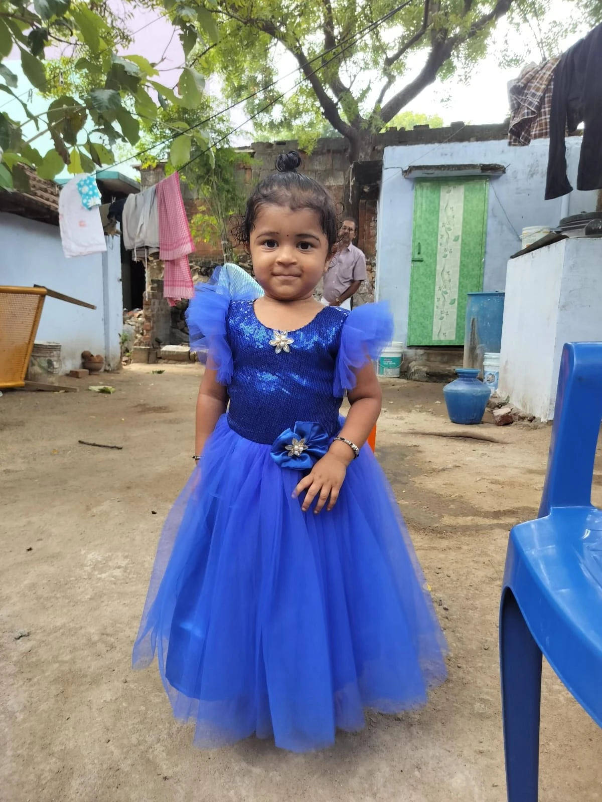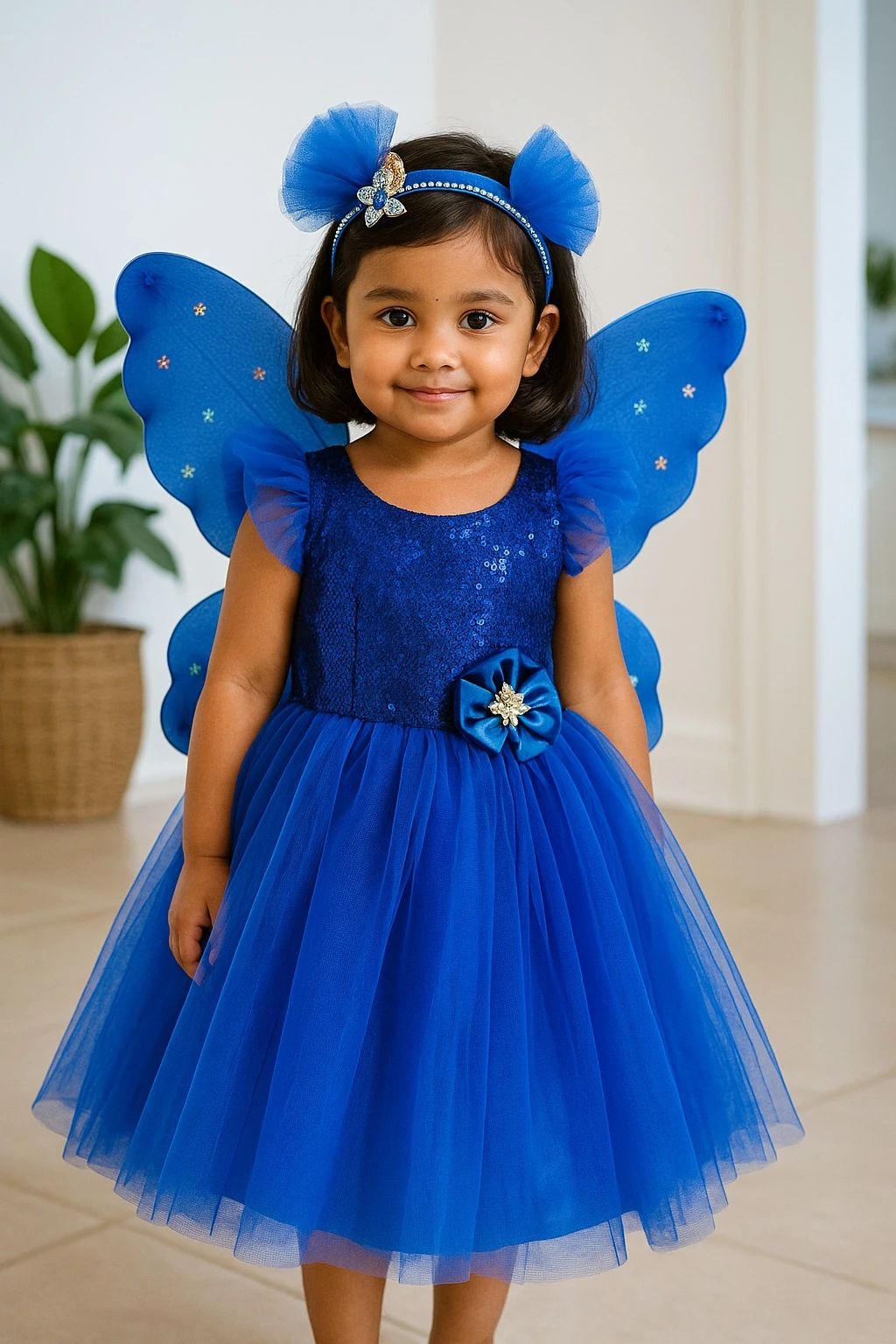Transform your little one into a magical fairy with our handcrafted Royal Blue Princess Frock set. Perfect for birthdays, photoshoots, festive events, and dress-up play, this outfit combines comfort, sparkle, and fairy-tale charm. Designed with care, this set includes a sequined bodice, soft tulle skirt, matching butterfly wings, and a charming hairband with fluffy accents.